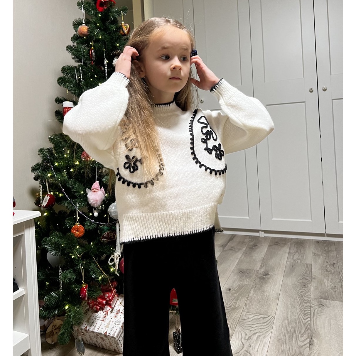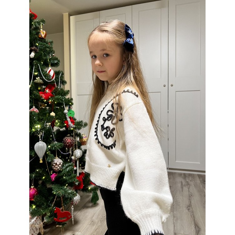 Трикотажный костюм из брюк и свитера, воротник стойка и декоративный контрастный узор.