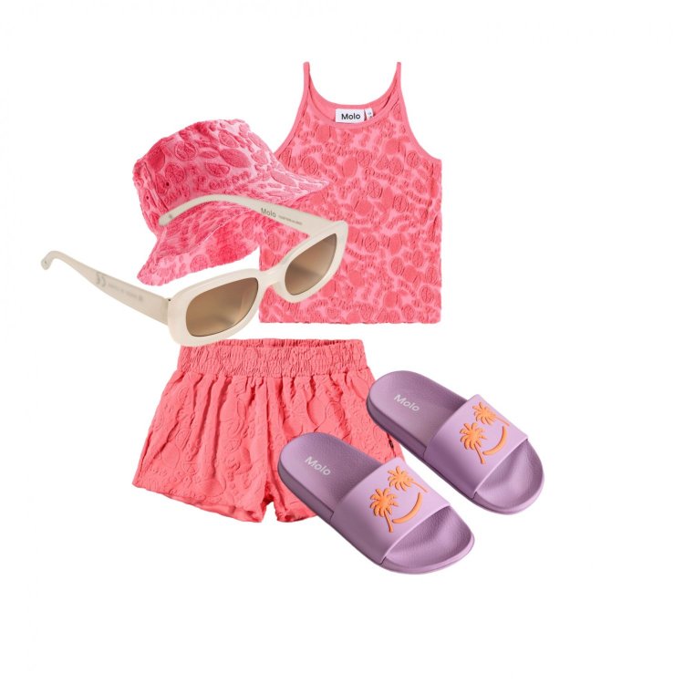 Розовые плавательные шорты с цитрусовым рисунком для активных детей, с защитой от УФ-излучения UV50+. Свободный крой, внутренние шорты, эластичный пояс и шнурок для удобства надевания и снимания.