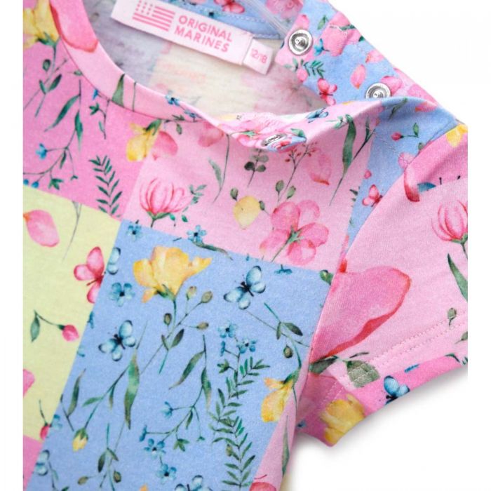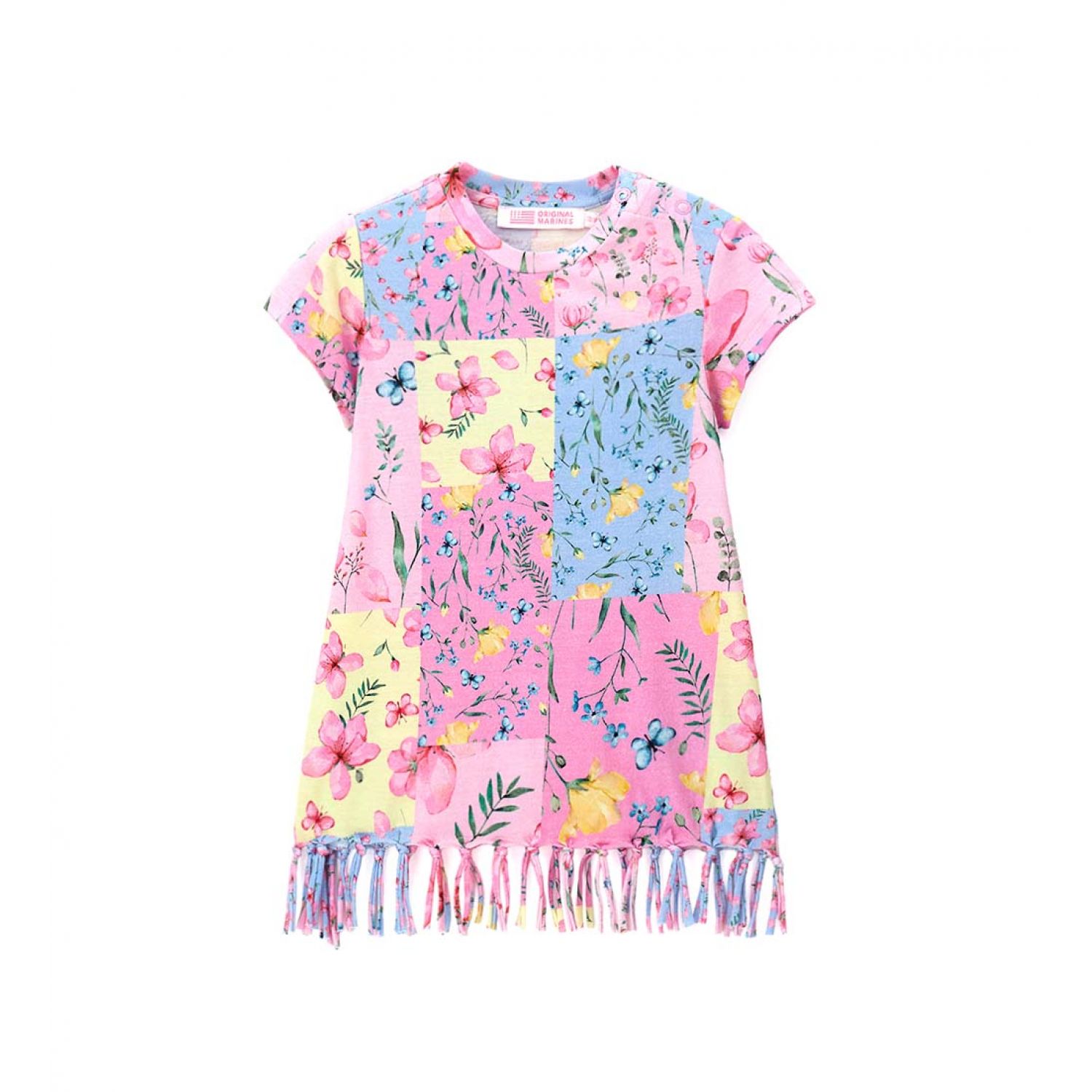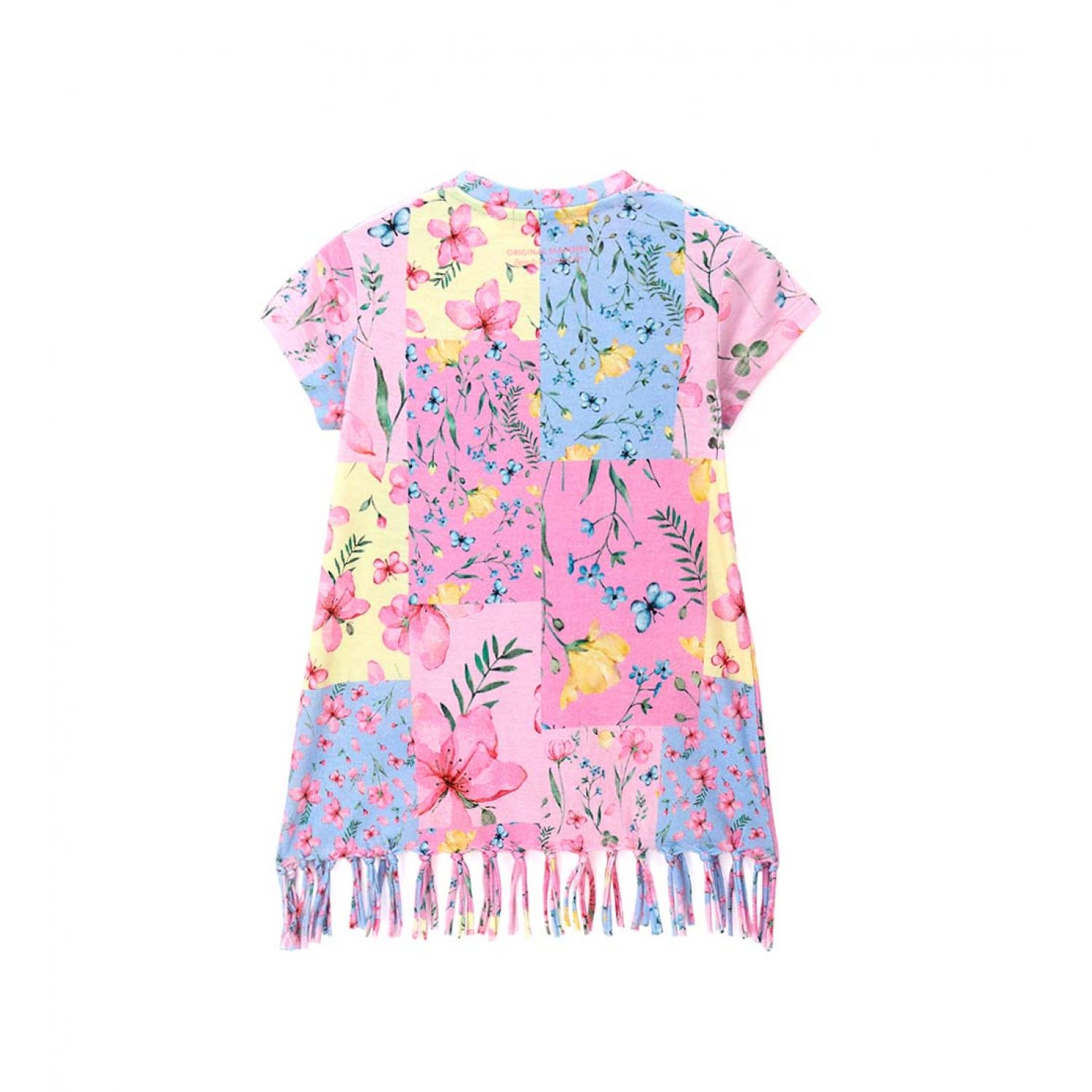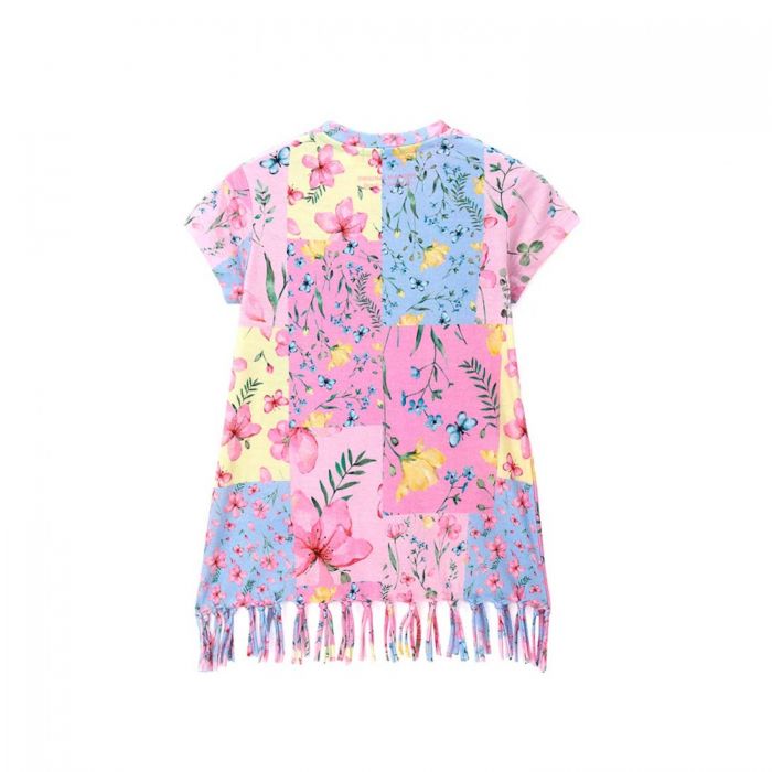 Яркое платье из натурального хлопка, круглый вырез горловины. По низу изделия узор в виде бахромы.